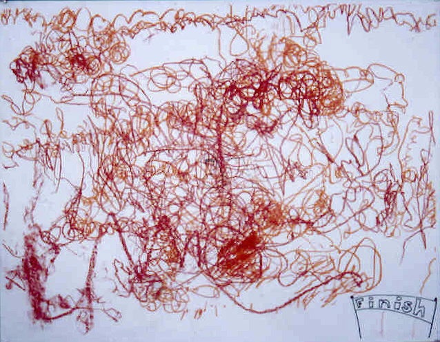 I think this was the first of my floor, music drawings. I would tape it down to the floor, light candles, cue up the song on the stereo with my headphones ready and the box of oil pastels beside me, close my eyes, choose a pastel for each hand and then hit play on the stereo remote. The music would be all absorbing and I would reactively draw how the music felt, as if the music was flowing through my arms onto the paper. The magical part would come when I found myself focusing more on what one hand was doing than the other, and the "free" hand which I wasn't focusing on would just float on it's own to the music, giving some beautifully lyrical passages of line. When the song ended, I went back in and drew the "Start" and "Finish" points on this drawing, but didn't always do that. Most people see these as scribbles. I got some funny looks when I showed these... actually I was asked to take my drawings down from a restaurant when I showed a group of them. I can laugh about it now. Ha.