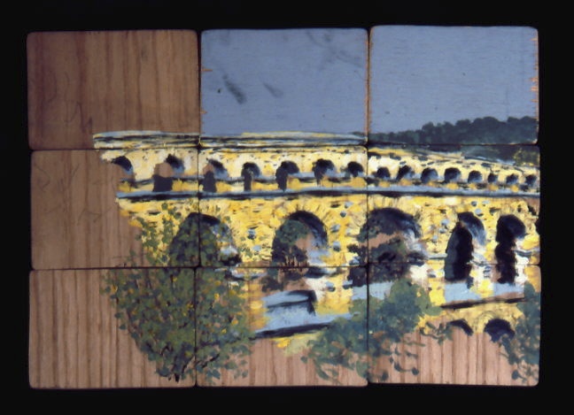 A short distance from Avignon, France is located the Roman aqueduct known as Pont du Gard. Unfortunately we missed the morning bus to take us there and had to catch the next bus which wasn't until the late afternoon, giving us a very short window in which to visit and paint the site. As a result, we never actually got to go down to the viaduct itself. We had to pack up quickly, so the painting is technically "unfinished", but I quite like the state it ended up in, and I consider it to be quite finished.