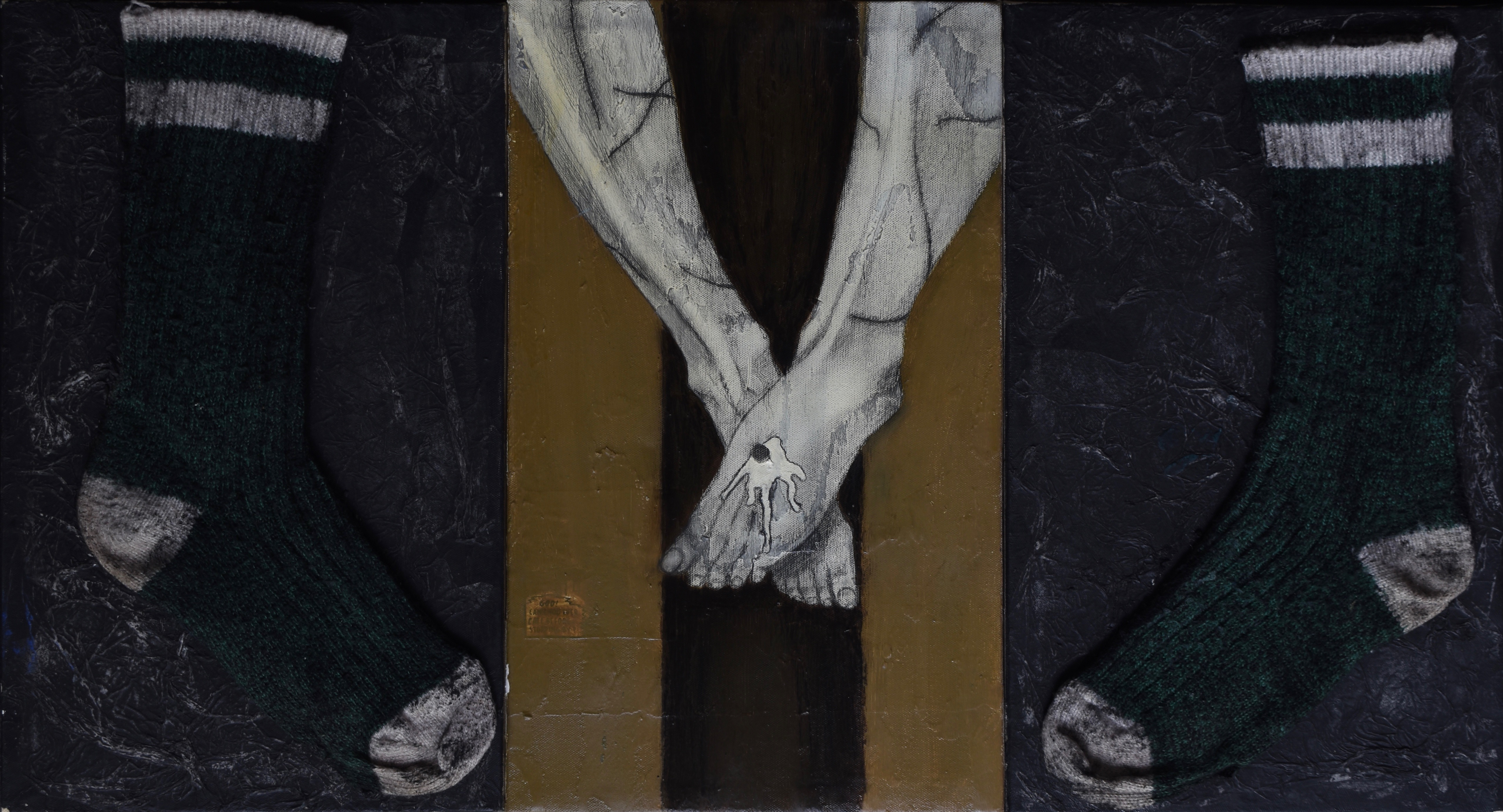 Graphite, Acrylic Latex Paint, Wool Socks,Collage on 3 Canvas